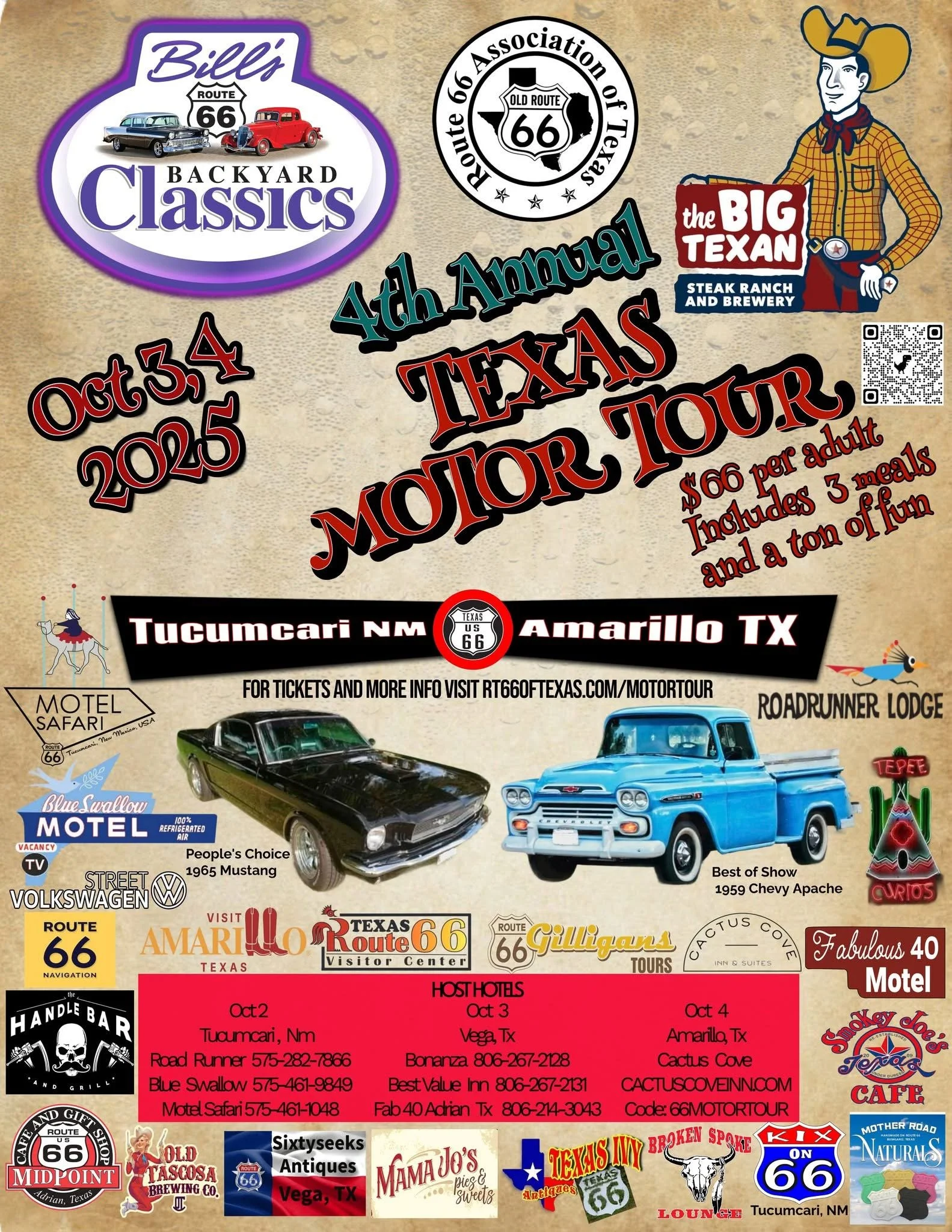 Join us as we caravan along old route 66 from Tucumcari, New Mexico to Amarillo, Texas. Your $66 entry fee Includes Lunch on Friday and Saturday as well as our Banquet Dinner at the Big Texan on Saturday Night. Entertainment and Music in Tucumcari Thursday Night. Admission to museums and entertainment during the Tour . We try to spend your entry fee on YOU to make sure you have a wonderful time on the motor tour.